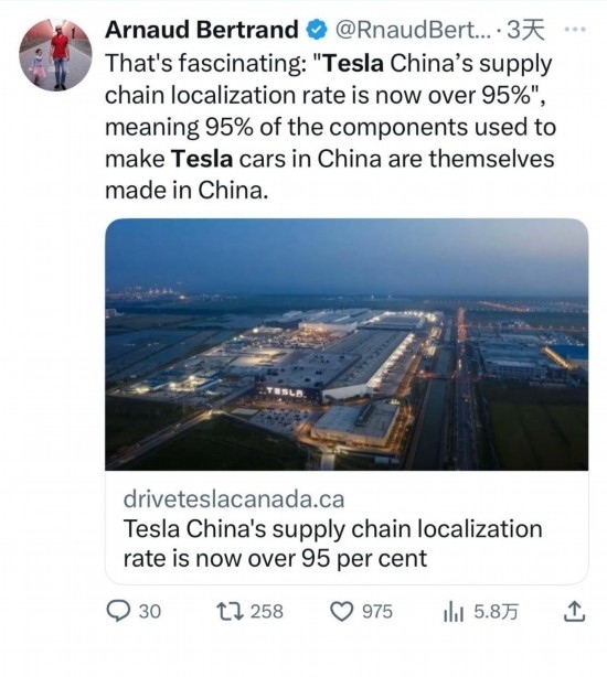 貝特朗還常為中國發(fā)展“點贊”。他在轉(zhuǎn)發(fā)特斯拉上海超級工廠新聞時由衷贊嘆:“真是太厲害了,這表示在中國生產(chǎn)特斯拉汽車所用的95%的零部件都是中國制造?!保▍⑴c記者:陳紹華、張曼;視頻:淡然、王沛;編輯:魯豫、王豐豐、杜逾舸、孫浩)