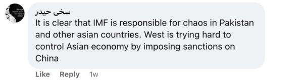還有網(wǎng)友留言說:“國際貨幣基金組織對巴基斯坦和其他亞洲國家的混亂負有責(zé)任,這一點再清楚不過了。西方試圖通過制裁中國來控制亞洲經(jīng)濟?!?/p>