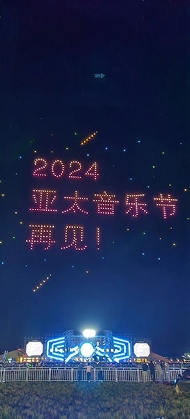 在氣氛最熱烈的時候,500架無人機(jī)緩緩升空,列隊(duì)表演,不斷變換陣型,時而在空中呈現(xiàn)出“亞太音樂節(jié)”、“中國外文局亞太傳播中心”、“太仆寺旗歡迎您”等巨幅字幕,時而呈現(xiàn)吉他、音符、蒙古包等色彩繽紛的圖案。