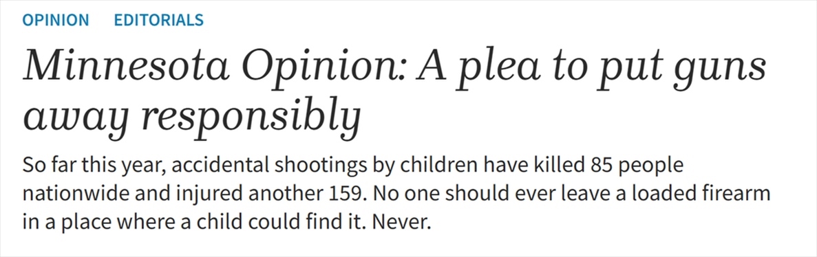 美國KSDK新聞網(wǎng)站報道稱,根據(jù)美國疾病控制與預(yù)防中心(CDC)的數(shù)據(jù),槍支暴力是導(dǎo)致美國兒童死亡的主要原因,而槍擊很多時候發(fā)生在家里。美國《圣迭戈時報》(Times of San Diego)網(wǎng)站的報道也指出,美國大多數(shù)涉及兒童的意外槍擊死亡都是未被鎖起來保存的已上膛槍支造成的。