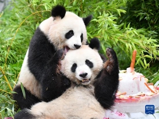 8月31日,大熊貓“夢想”(左)和“夢圓”在德國柏林動物園享用“生日餐”。當(dāng)日,在德國出生的大熊貓雙胞胎兄弟“夢想”和“夢圓”迎來4歲生日,柏林動物園為它們舉辦了慶?;顒印P氯A社記者 任鵬飛 攝