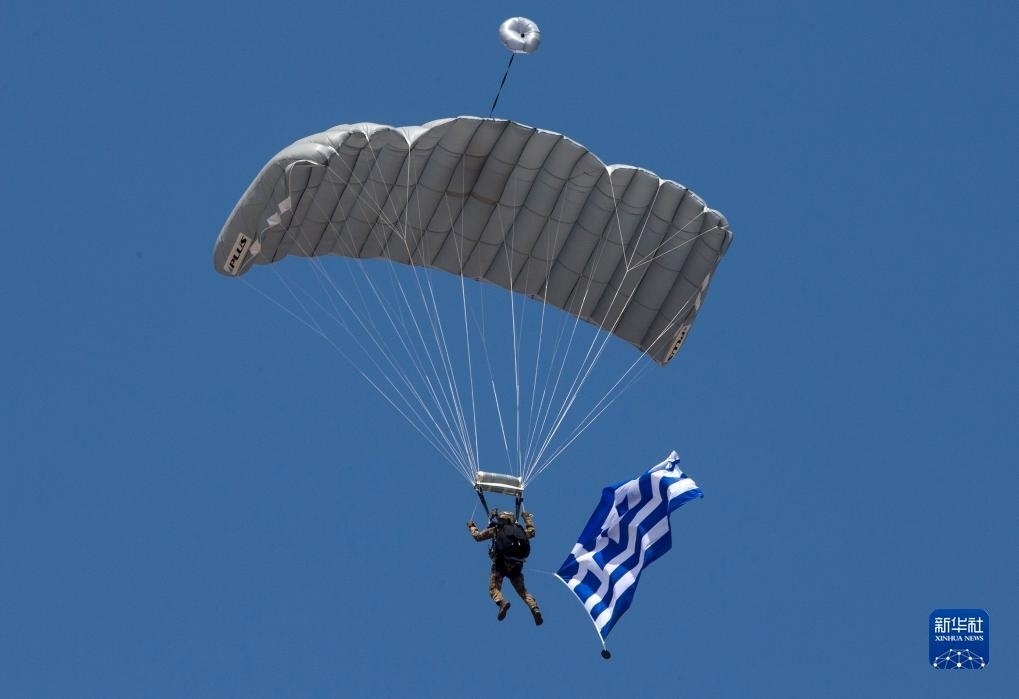 9月2日,在希臘塔納格拉空軍基地的雅典飛行周上,跳傘員在空中展示希臘國旗。新華社發(fā)(馬里奧斯·羅洛斯攝)