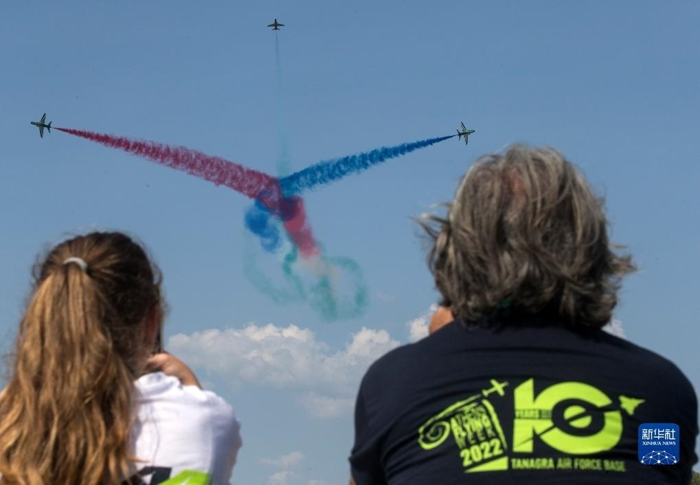 9月2日,在希臘塔納格拉空軍基地的雅典飛行周上,來自意大利的飛行表演隊進行表演。新華社發(fā)(馬里奧斯·羅洛斯攝)
