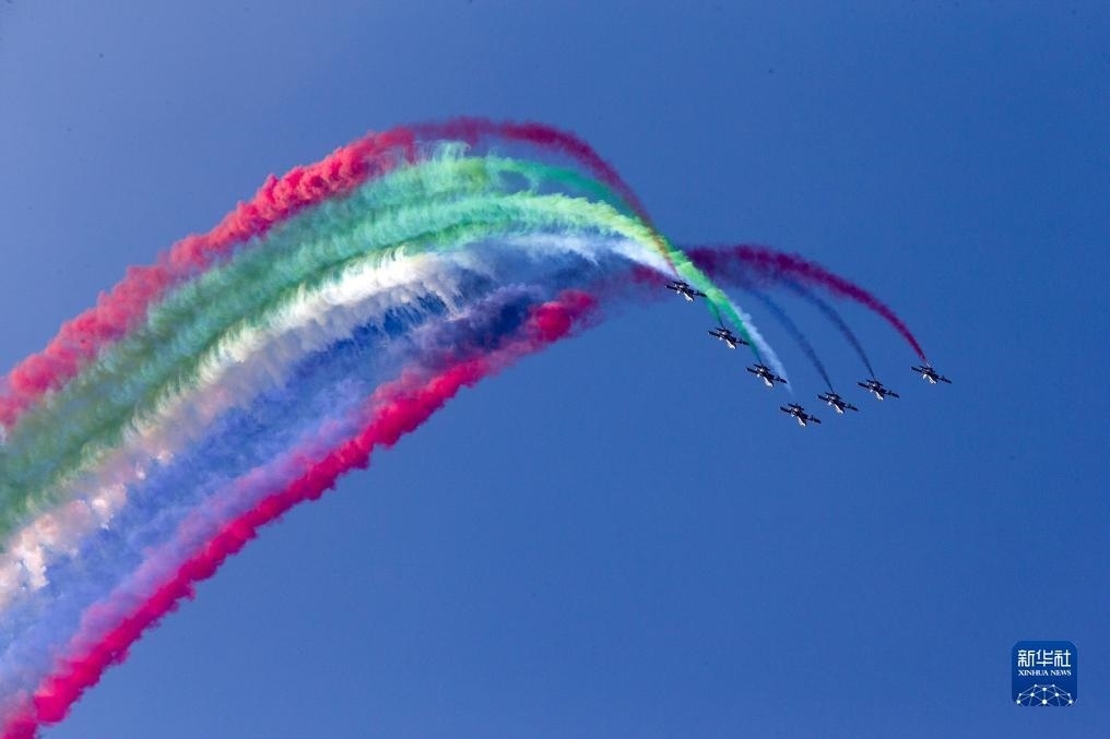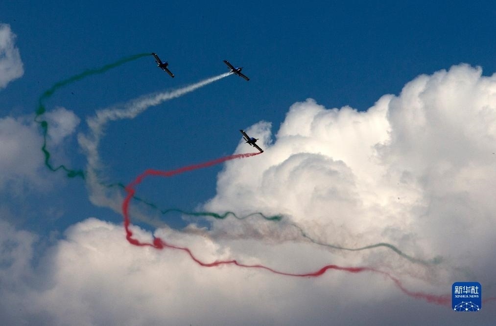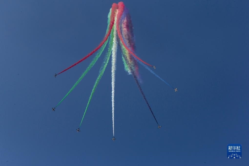 9月2日,在希臘塔納格拉空軍基地的雅典飛行周上,來自阿聯(lián)酋的飛行表演隊進行表演。新華社發(fā)(馬里奧斯·羅洛斯攝)