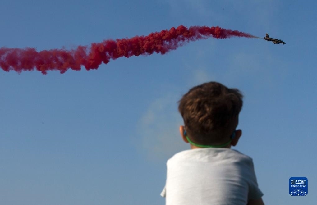 9月2日,一名男孩在希臘塔納格拉空軍基地舉行的雅典飛行周上觀看阿聯(lián)酋飛行表演隊的表演。新華社發(fā)(馬里奧斯·羅洛斯攝)