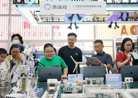 9月3日,在首鋼園教育服務(wù)專題展區(qū),小朋友在體驗(yàn)智能硬件編程作品。新華社記者 張晨霖 攝
