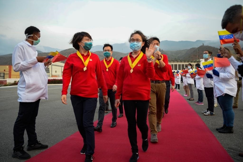 2020年4月11日,在委內(nèi)瑞拉首都加拉加斯,中國抗疫醫(yī)療專家組在授勛儀式結(jié)束后登機(jī)回國。新華社發(fā)(薩爾戈多攝)