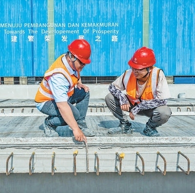 馬來(lái)西亞吉蘭丹州的馬東鐵項(xiàng)目一分部制梁場(chǎng),技術(shù)人員討論生產(chǎn)情況。新華社記者 朱 煒攝
