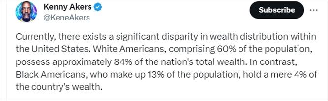 美國(guó)網(wǎng)友發(fā)文批評(píng)美國(guó)財(cái)富不平等現(xiàn)象表示,占據(jù)美國(guó)總?cè)丝?0%的白人擁有全美大約84%的財(cái)富,而占據(jù)人口13%的美國(guó)非裔卻只擁有4%。