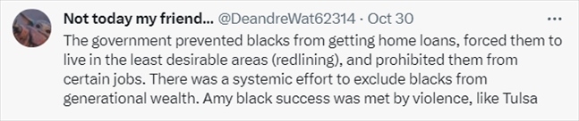 還有網(wǎng)友表示,美國(guó)政府在加劇美國(guó)財(cái)富不平等方面“功不可沒(méi)”。在美國(guó)政策高壓之下,非裔甚至不配擁有住房。