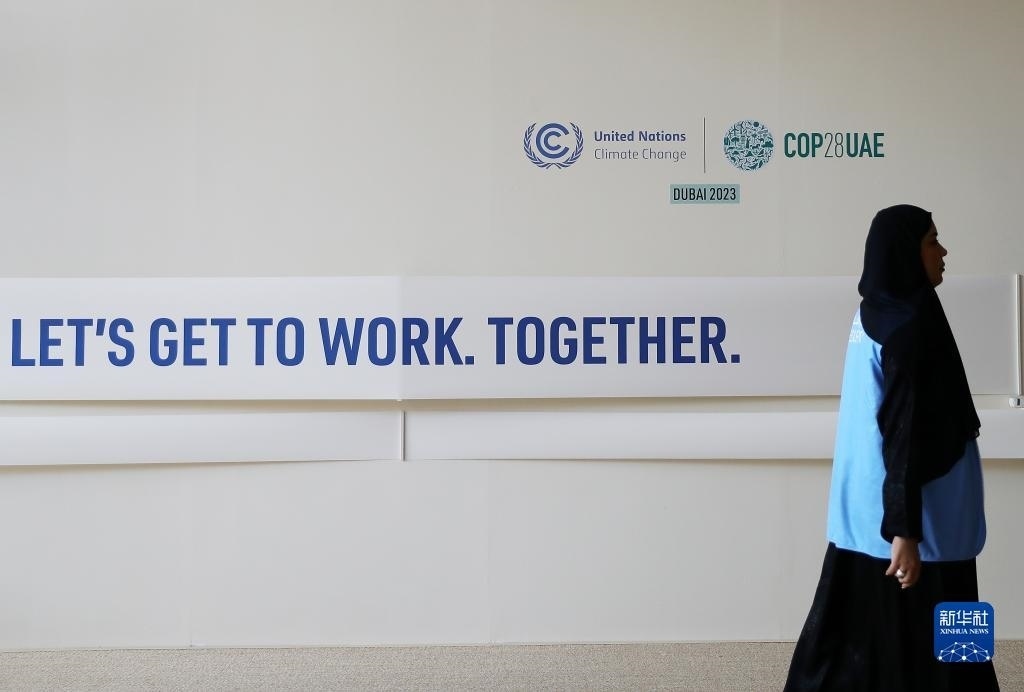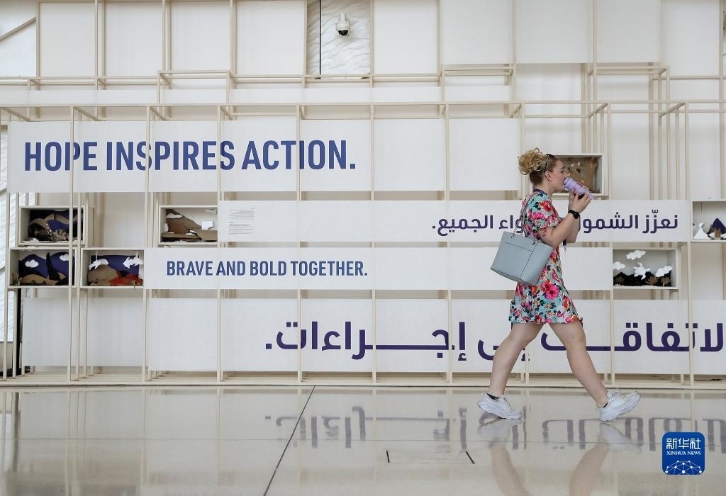 12月12日,在阿聯(lián)酋迪拜,一名女子走在聯(lián)合國(guó)氣候變化迪拜大會(huì)會(huì)場(chǎng)內(nèi)。新華社記者 王東震 攝