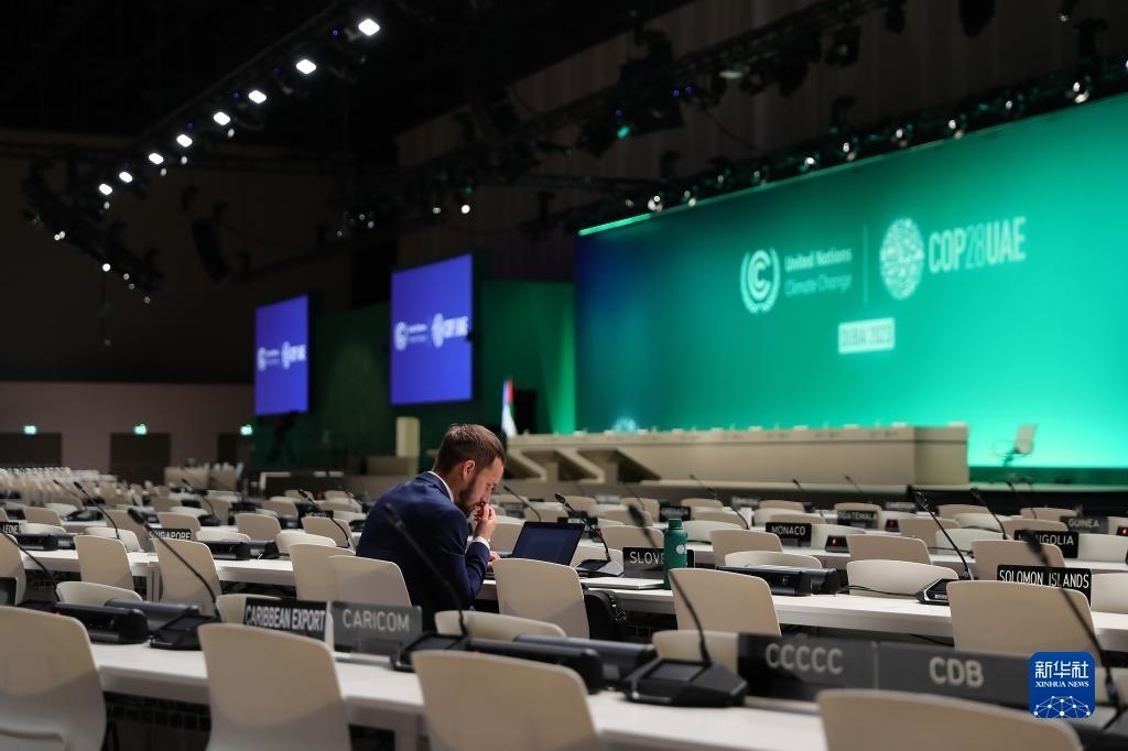 12月12日,在阿聯(lián)酋迪拜,參會(huì)人員在聯(lián)合國(guó)氣候變化迪拜大會(huì)會(huì)場(chǎng)內(nèi)工作。新華社記者 王東震 攝