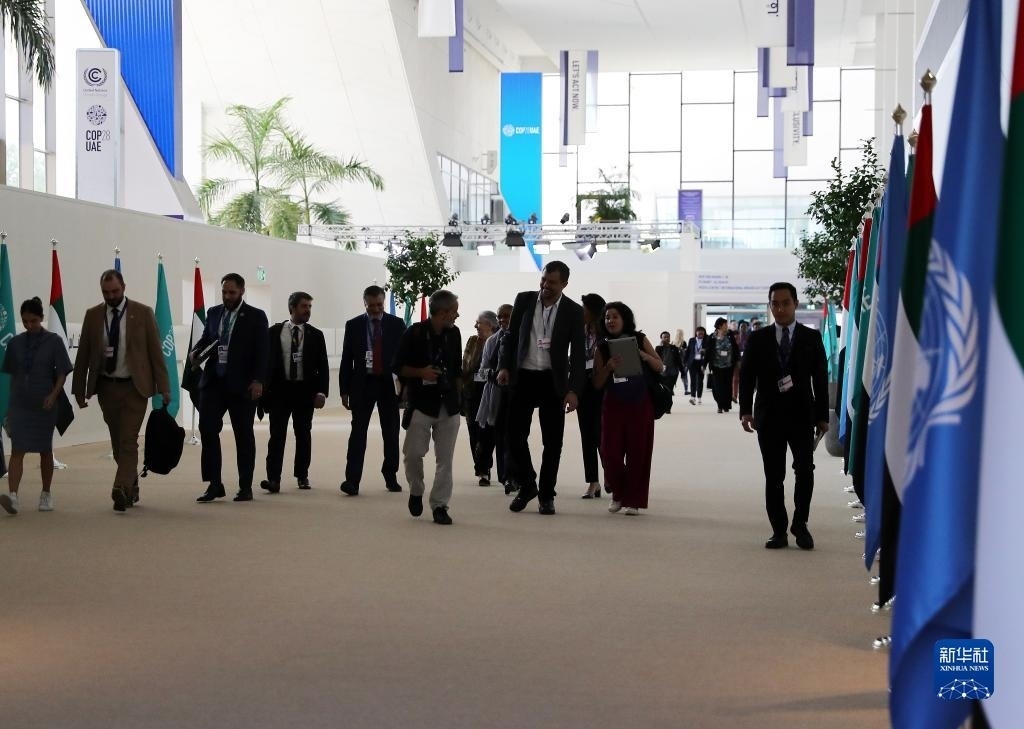 12月12日,在阿聯(lián)酋迪拜,參會(huì)人員走在聯(lián)合國(guó)氣候變化迪拜大會(huì)會(huì)場(chǎng)內(nèi)。新華社記者 王東震 攝