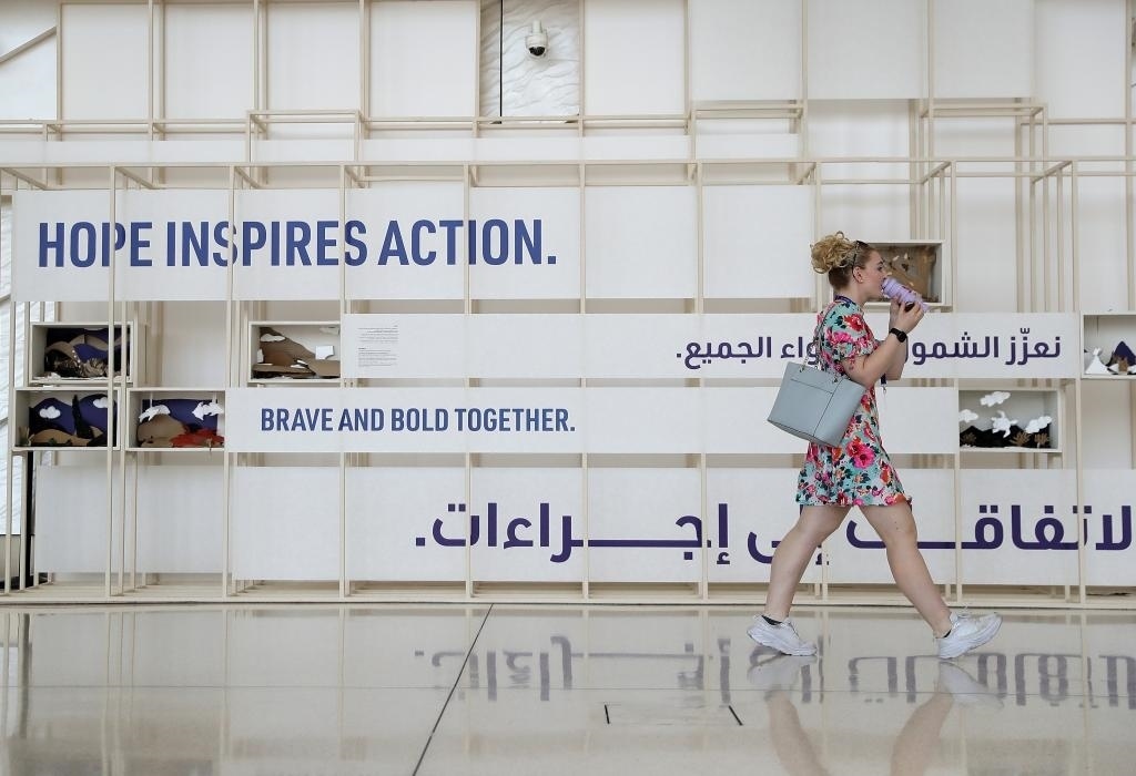 12月12日,在阿聯(lián)酋迪拜,一名女子走在聯(lián)合國氣候變化迪拜大會(huì)會(huì)場內(nèi)。新華社記者王東震攝