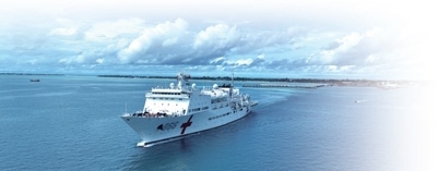7月22日,正在執(zhí)行“和諧使命—2023”任務(wù)的中國海軍“和平方舟”號醫(yī)院船結(jié)束對基里巴斯的訪問駛離塔拉瓦港。桂江波攝(新華社發(fā))