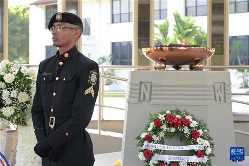 1月9日,在巴拿馬首都巴拿馬城,巴拿馬政府在“永恒之火”紀(jì)念碑旁舉辦“護(hù)旗運(yùn)動(dòng)”60周年紀(jì)念儀式,照片中的石柱紀(jì)念的是在美國軍警鎮(zhèn)壓中死亡的第一位學(xué)生阿羅塞梅納。新華社記者 陳昊佺 攝