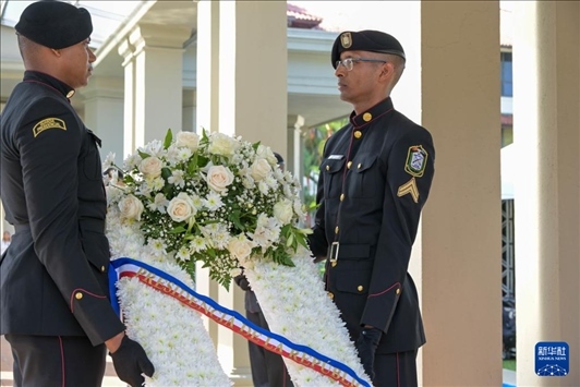 1月9日,在巴拿馬首都巴拿馬城,兩名士兵向紀(jì)念“護(hù)旗運(yùn)動(dòng)”的“永恒之火”紀(jì)念碑獻(xiàn)花圈。新華社記者 陳昊佺 攝