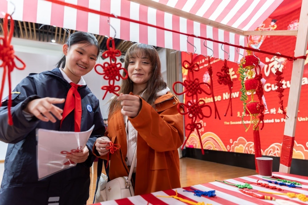 1月28日,復旦大學第二附屬學校學生(左)為馬斯卡廷學生(右)介紹中國結。