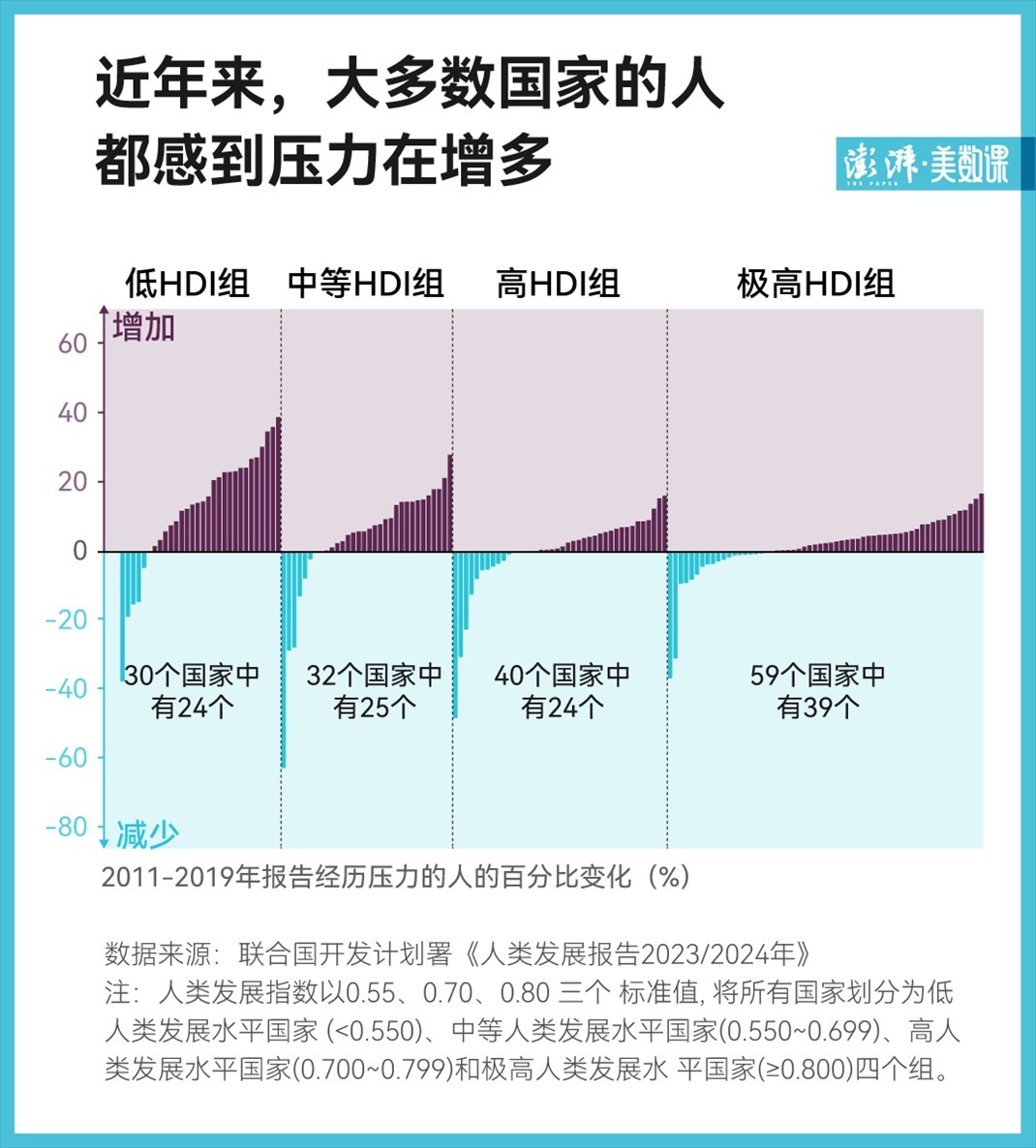 但其中低人類發(fā)展水平組、中人類發(fā)展水平組中,有約 80% 的國(guó)家個(gè)人壓力上升,且上升幅度較大,而高人類發(fā)展水平組和極高人類發(fā)展水平組的個(gè)人壓力上升幅度相對(duì)較小,這意味著欠發(fā)達(dá)國(guó)家的居民將面臨更大的壓力。