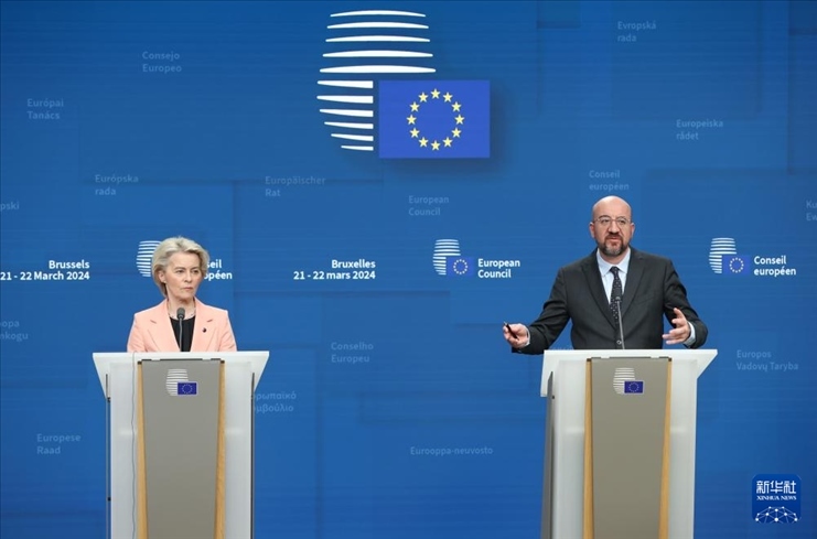 3月21日,在比利時布魯塞爾,歐洲理事會主席米歇爾(右)、歐盟委員會主席馮德萊恩在歐盟峰會期間出席新聞發(fā)布會。新華社記者 趙丁喆 攝