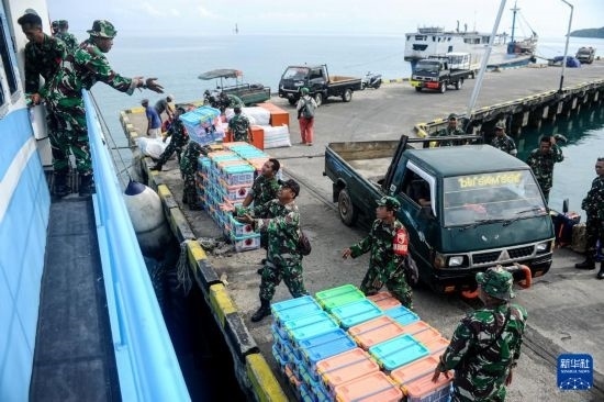 3月25日,在印度尼西亞巴韋安島,印尼軍人搬運(yùn)印尼國家災(zāi)害管理局發(fā)放的救援物資。