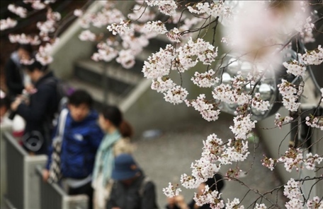 2016年4月1日,在日本首都東京,游客在千鳥(niǎo)淵賞櫻。新華社記者劉天攝
