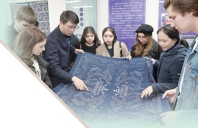 2024年3月20日,在江蘇南通市崇川區(qū)“文化崇川 游我所愛(ài)”中外文化交流活動(dòng)中,來(lái)自俄羅斯、巴基斯坦、印度尼西亞、盧旺達(dá)等國(guó)家的學(xué)生現(xiàn)場(chǎng)了解藍(lán)印花布印染技藝。許叢軍攝(人民視覺(jué))