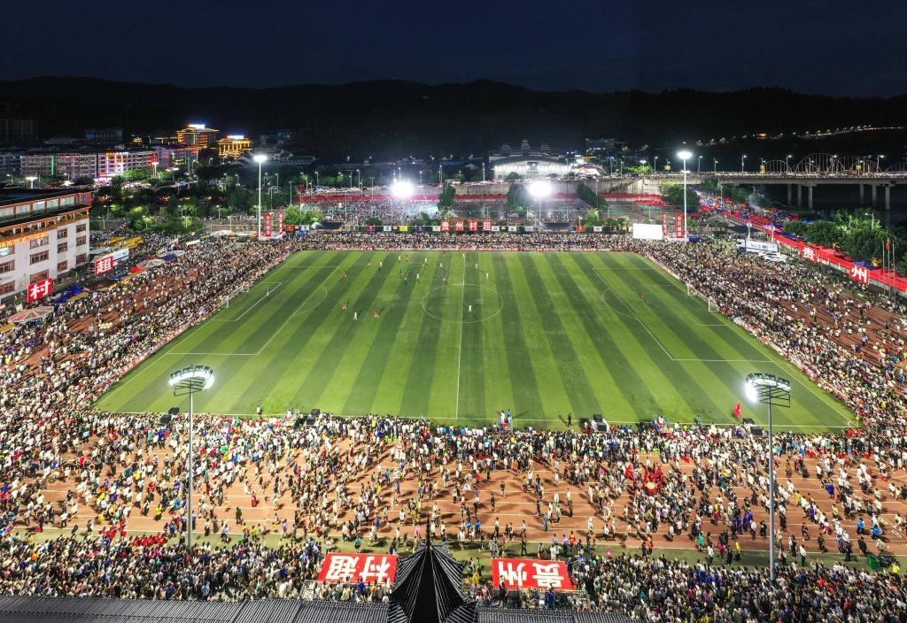 ?2023年7月1日,人們在觀看貴州“村超”足球賽(無人機照片)。新華社記者楊文斌攝