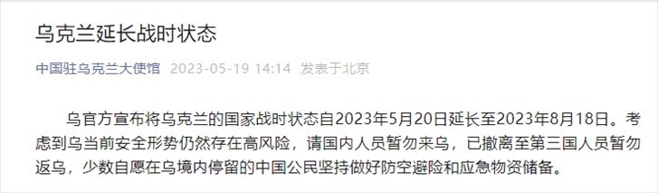 烏克蘭延長戰(zhàn)時狀態(tài)至8月18日 烏官方宣布將烏克蘭的國家戰(zhàn)時狀態(tài)自2023年5月20日延長......