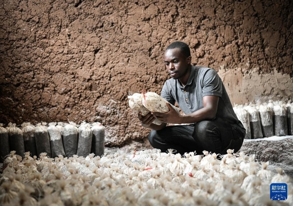 8月14日,在盧旺達(dá)南方省穆漢加區(qū),尼揚(yáng)博·奧貝德在食用菌培育工坊內(nèi)檢查菌袋。曾兩次赴中國進(jìn)行菌草技術(shù)培訓(xùn)的尼揚(yáng)博·奧貝德在南方省和東方省各擁有一家工坊。