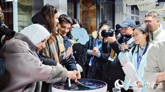 外媒記者在大盛魁博物館集群內(nèi)舉著“?!弊趾嫌傲裟?。人民網(wǎng)記者 劉藝琳攝