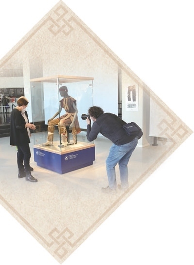 加入科研團(tuán)隊(duì)的德國服裝設(shè)計(jì)師卡特琳·迪爾斯娜第一次接觸古代服飾文物,但多年來為歷史題材電影和戲劇制作服飾的經(jīng)驗(yàn)對(duì)她很有幫助。此次全套服裝包括素絹高領(lǐng)短衫、粉色拼接藍(lán)色羊毛束口長(zhǎng)褲、與長(zhǎng)褲同色系的羊毛短靴(靴口為素絹)、素色絲質(zhì)裹身半裙、裝飾與配色同樣考究的套頭長(zhǎng)袍,以及下緣綴有風(fēng)琴褶的淺金拼淡玫紅色絲質(zhì)大衣——經(jīng)過科學(xué)復(fù)原,古代服飾的時(shí)尚審美與紡織技藝令人嘆服,衣物主人的綽約風(fēng)姿也穿越千年風(fēng)沙,宛在眼前?!翱吹竭@些服裝一件件穿在真人模特身上,完美地隨身搖擺,我被深深打動(dòng)。那一刻,我和2000多年前的人與物情感相連,感受相通?!钡蠣査鼓日f。