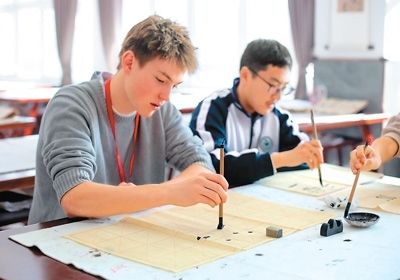 圖為活動(dòng)期間,來自美國(guó)得克薩斯州圣史蒂芬圣公會(huì)學(xué)校的學(xué)生查爾斯·錢寧·達(dá)根(左)在河北衡水中學(xué)學(xué)習(xí)書法。