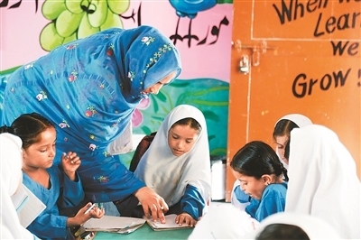 走進(jìn)干凈整潔的校園,讀書聲、嬉戲聲聲聲入耳,孩童的活力、青春氣息撲面而來。在八年級的課室里,戴著一條寫有“文學(xué)比賽冠軍”紅綬帶的女學(xué)生薩伊巴·阿斯加爾·阿里成功搶到了回答問題的機(jī)會,正在大聲地在全班面前朗誦英語課文。薩伊巴告訴記者,她有7個姐妹,如果沒有這所學(xué)校,她可能就沒學(xué)上了。