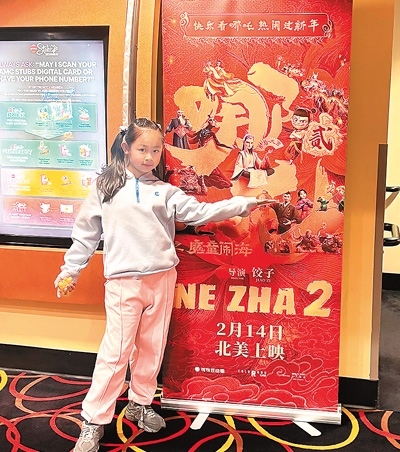 圖為唐夢竹的女兒在美國洛杉磯一家影院的《哪吒之魔童鬧海》宣傳海報(bào)前留影。