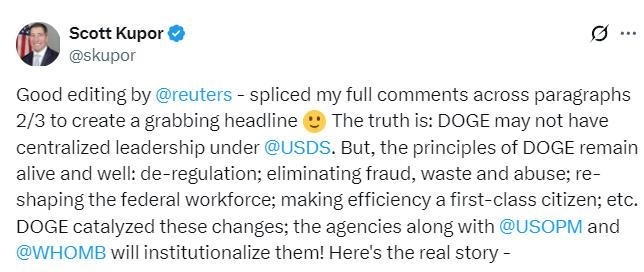 庫珀表示,“政府效率部”或許不再會有“集中化的領導”,但其工作準則將繼續(xù)保留:減少章程架構;減少欺詐、浪費和濫用;重塑聯(lián)邦人力結構;將效率放在首位等等。“政府效率部”催動了相關變革,美國人事管理局、白宮管理和預算辦公室一起將其制度化,“這才是真相”。