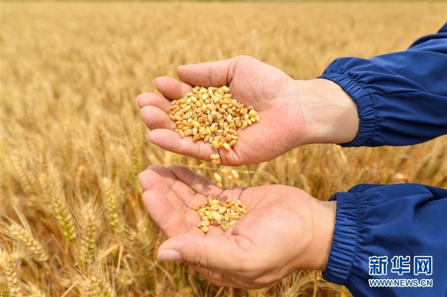 6月2日,在河北省邯鄲市臨漳縣狄邱鄉(xiāng)西狄邱村,農(nóng)業(yè)技術人員在麥田內(nèi)查看麥粒飽滿度。 新華社記者王曉攝