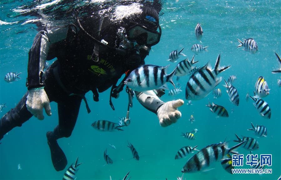 在海南三亞蜈支洲島海域拍攝的與??采男〕篝~(5月28日攝)。海南省三亞蜈支洲島海域海洋牧場是海南首個國家級海洋牧場示范區(qū),也是中國第一個位于熱帶地區(qū)的海洋牧場。近年來,蜈支洲島海域海洋牧場推進海洋生態(tài)系統(tǒng)的恢復(fù)和保護,先后開展了人工魚礁投放、海洋環(huán)境修復(fù)、珊瑚移植等工作。截至2019年底,蜈支洲島海域海洋牧場共投放各類人工魚礁1526塊、船礁21艘和一批火山石礁,共達4萬空立方米,礁區(qū)海域的漁業(yè)資源比非礁區(qū)要高5倍以上。目前,蜈支洲島海域海洋牧場已初現(xiàn)雛形。新華社記者楊冠宇攝