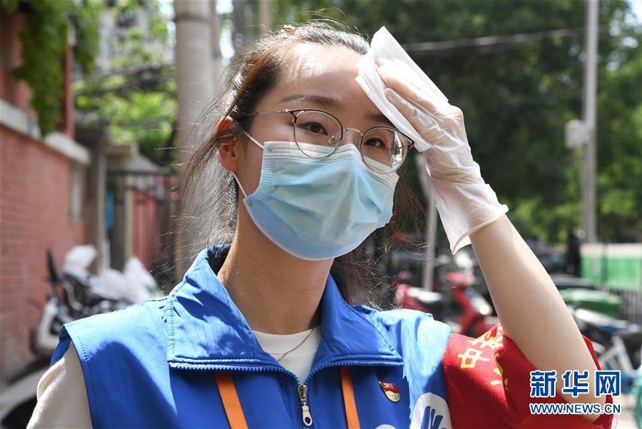 6月16日,在北京市海淀區(qū)中關(guān)村街道白塔庵社區(qū)出入口,疫情防控志愿者王玥在擦拭汗水。連日來,北京出現(xiàn)高溫天氣??崾钪校ぷ魅藛T堅(jiān)守抗擊疫情一線,成為烈日下的“逆行者”。新華社記者任超攝