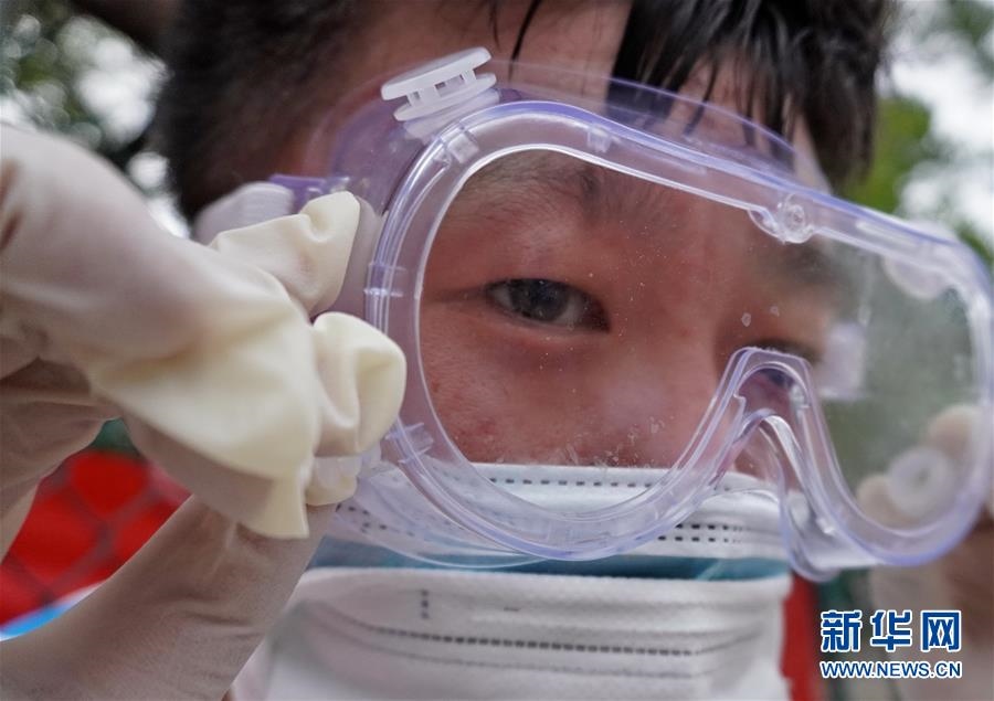 豐臺區(qū)東高地街道社區(qū)衛(wèi)生服務(wù)中心一位醫(yī)護(hù)人員的護(hù)目鏡內(nèi)流進(jìn)了汗水(6月15日攝)。連日來,北京出現(xiàn)高溫天氣。酷暑中,工作人員堅(jiān)守抗擊疫情一線,成為烈日下的“逆行者”。新華社記者李欣攝