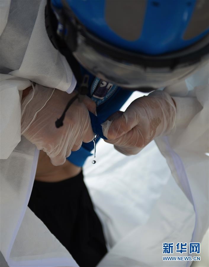 6月16日,北京藍(lán)天救援隊(duì)完成消殺任務(wù)后,一位隊(duì)員的衣服被擰出了汗水。連日來,北京出現(xiàn)高溫天氣。酷暑中,工作人員堅(jiān)守抗擊疫情一線,成為烈日下的“逆行者”。新華社發(fā)(陳鐘昊攝)