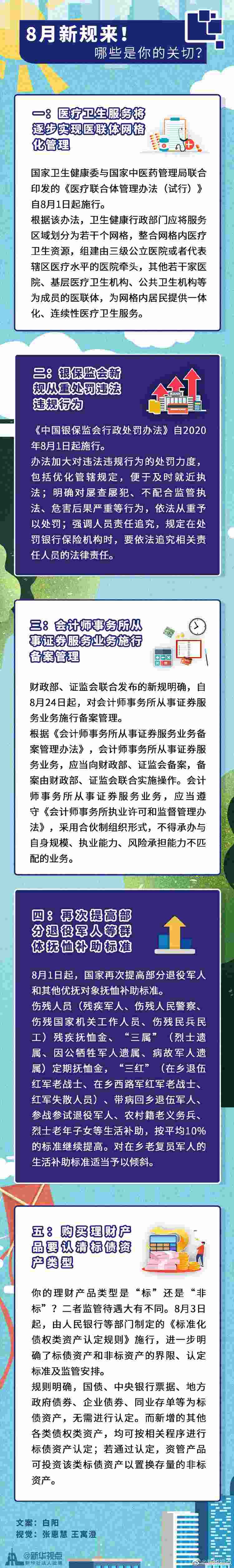 居民看病將逐步實(shí)現(xiàn)醫(yī)聯(lián)體網(wǎng)格化服務(wù)、銀保監(jiān)會(huì)新規(guī)進(jìn)一步提升金融違法違規(guī)成本、部分退役軍人和其他優(yōu)撫對(duì)象撫恤補(bǔ)助標(biāo)準(zhǔn)再次提高……這個(gè)8月,又有一批新規(guī)開(kāi)始施行,影響你我的生活。
