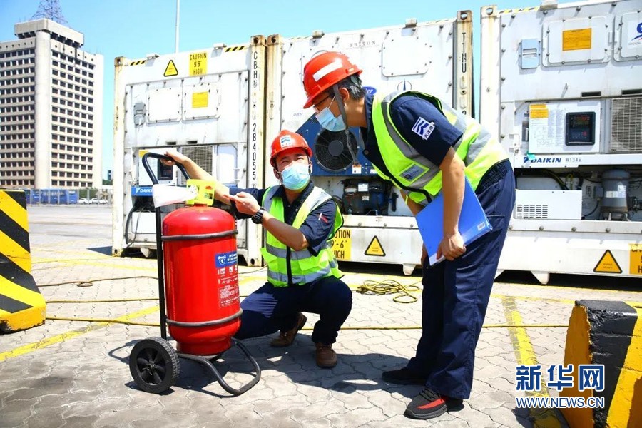 烈日當(dāng)空,天津港集裝箱碼頭公司安全員正在冷箱堆存場(chǎng)地檢查安全消防設(shè)施。新華網(wǎng)發(fā)