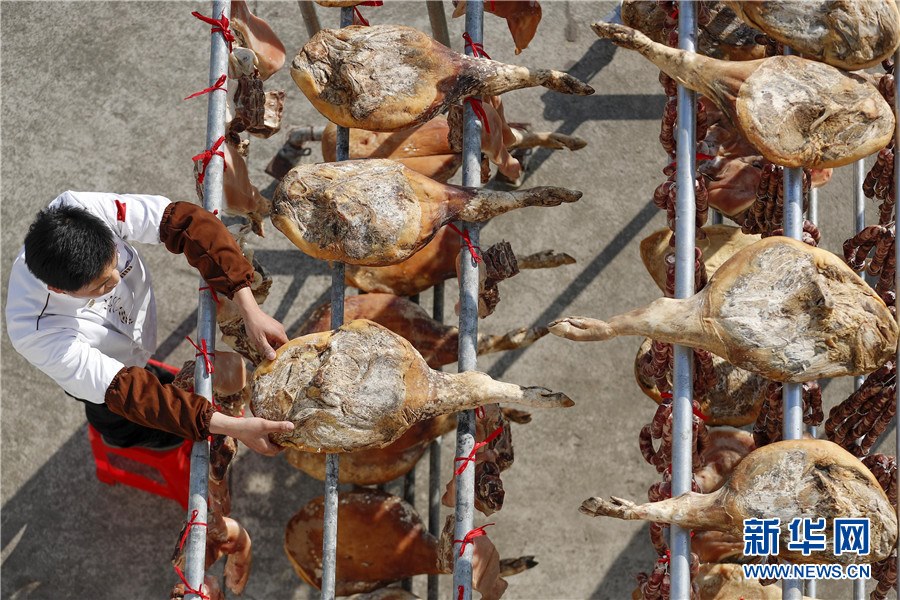 隨著春節(jié)臨近,安徽省黃山市徽州區(qū)西溪南鎮(zhèn)村民開(kāi)始制作徽州傳統(tǒng)臘味,腌制火腿、臘肉,灌制香腸,并進(jìn)行晾曬。臘味飄香,年味漸濃,制作、晾曬傳統(tǒng)臘味成為徽州一道獨(dú)特風(fēng)景。新華網(wǎng)發(fā)(施亞磊攝)