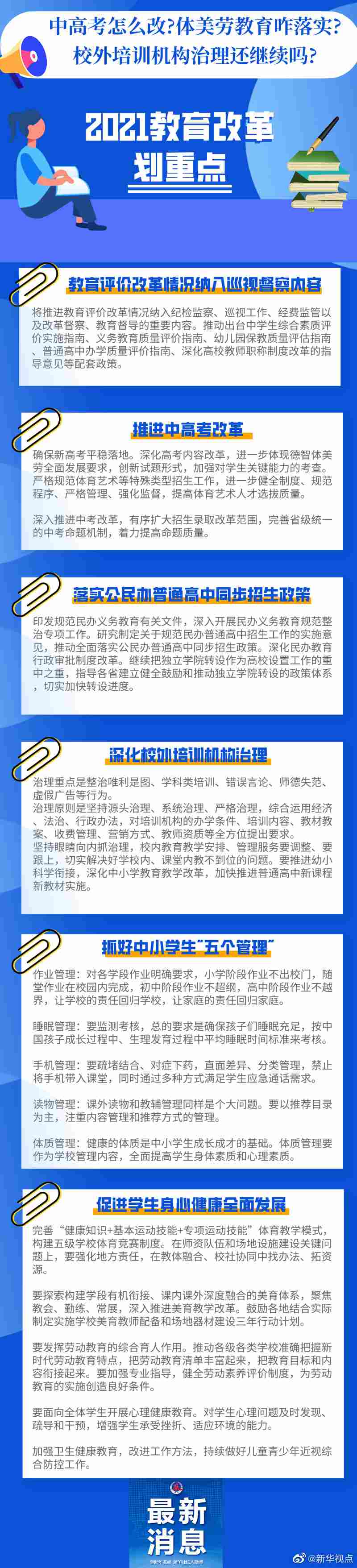 中高考怎么改?體美勞教育咋落實?校外培訓機構治理還繼續(xù)嗎?中小學生作業(yè)、睡眠、手機、讀物、體質都要納入管理?這些社會關心的熱點,在2021年教育發(fā)展改革中都將涉及。記者梳理教育部部長陳寶生在2021年全國教育工作會議上的講話,及《教育部2021年工作要點》,為你劃出以下重點。詳情請見大圖↓↓(記者胡浩)