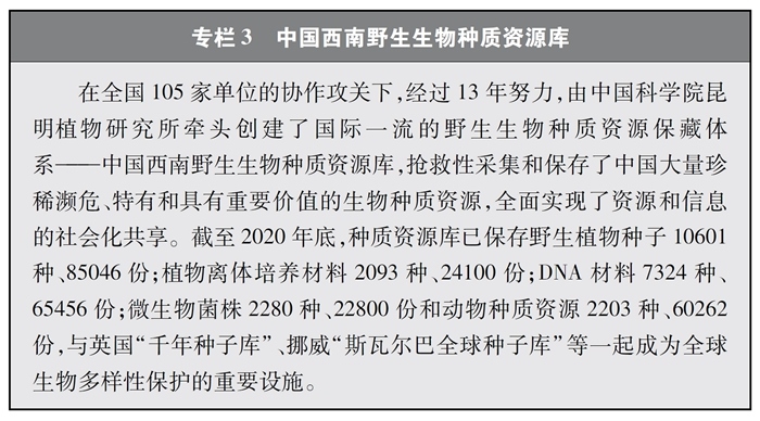 加快重要生物遺傳資源收集保存和利用。中國高度重視生物資源保護,近年來在生物資源調查、收集、保存等方面取得較大進展。實施戰(zhàn)略生物資源計劃專項,完善生物資源收集收藏平臺,建立種質資源創(chuàng)新平臺、遺傳資源衍生庫和天然化合物轉化平臺,持續(xù)加強野生生物資源保護和利用。實施一批種質資源保護和育種創(chuàng)新項目,截至2020年底,形成了以國家作物種質長期庫及其復份庫為核心、10座中期庫與43個種質圃為支撐的國家作物種質資源保護體系,建立了199個國家級畜禽遺傳資源保種場(區(qū)、庫),為90%以上的國家級畜禽遺傳資源保護名錄品種建立了國家級保種單位,長期保存作物種質資源52萬余份、畜禽遺傳資源96萬份。建設99個國家級林木種質資源保存庫,以及新疆、山東2個國家級林草種質資源設施保存庫國家分庫,保存林木種質資源4.7萬份。建設31個藥用植物種質資源保存圃和2個種質資源庫,保存種子種苗1.2萬多份。