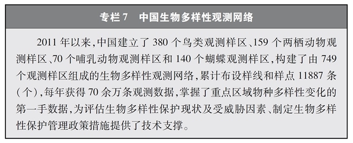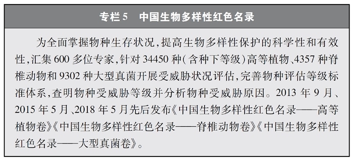 開展全國生物多樣性調查與評估。大力推進生物多樣性保護重大工程實施,結合自然資源調查、生態(tài)系統(tǒng)監(jiān)測評估等工作,不斷完善生物多樣性調查與評估能力,首次將生物多樣性指標納入生態(tài)質量綜合評價指標體系,引導地方加強生態(tài)文明建設與生物多樣性保護。開展自然資源調查,包括森林、草原、水、濕地、荒漠、海洋等,建立自然資源調查評價監(jiān)測制度。構建了涵蓋2376個縣級行政單元、樣線總長超過3.4萬公里的物種分布數(shù)據(jù)庫,建立物種資源調查及收集信息平臺,準確反映野生動植物空間分布狀況。完成長江經濟帶、京津冀等國家戰(zhàn)略區(qū)域180多個縣級行政區(qū)生物多樣性調查與評估。組織開展近海漁業(yè)資源調查,初步掌握近海漁業(yè)資源狀況。陸續(xù)發(fā)布《中國植物紅皮書》《中國瀕危動物紅皮書》《中國物種紅色名錄》《中國生物多樣性紅色名錄》,基本掌握生物多樣性總體情況,為加強生物多樣性保護奠定了科學基礎。
