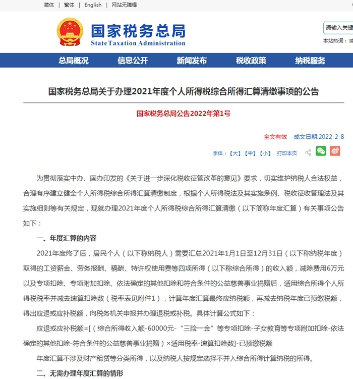 為貫徹落實(shí)中辦、國辦印發(fā)的《關(guān)于進(jìn)一步深化稅收征管改革的意見》要求,切實(shí)維護(hù)納稅人合法權(quán)益,合理有序建立健全個(gè)人所得稅綜合所得匯算清繳制度,根據(jù)個(gè)人所得稅法及其實(shí)施條例、稅收征收管理法及其實(shí)施細(xì)則等有關(guān)規(guī)定,現(xiàn)就辦理2021年度個(gè)人所得稅綜合所得匯算清繳(以下簡(jiǎn)稱年度匯算)有關(guān)事項(xiàng)公告如下:
