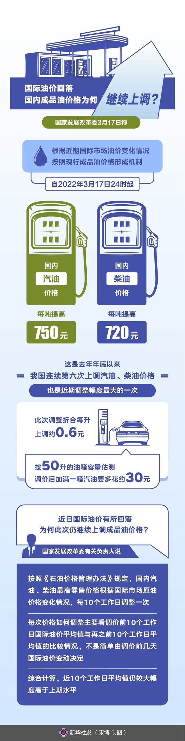 國(guó)家發(fā)展改革委17日稱,根據(jù)近期國(guó)際市場(chǎng)油價(jià)變化情況,按照現(xiàn)行成品油價(jià)格形成機(jī)制,自2022年3月17日24時(shí)起,國(guó)內(nèi)汽油、柴油價(jià)格每噸分別提高750元和720元。