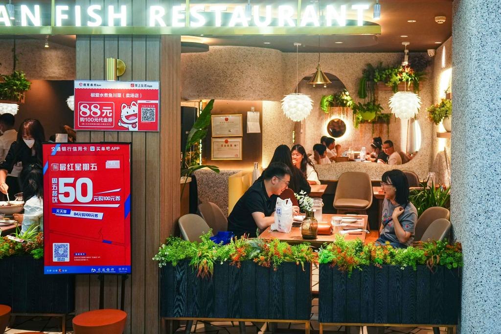 2022年5月28日,市民在長春市一家餐廳內(nèi)用餐。自這一天零時起,長春市各類生產(chǎn)經(jīng)營主體全面恢復營業(yè)。新華社記者許暢攝